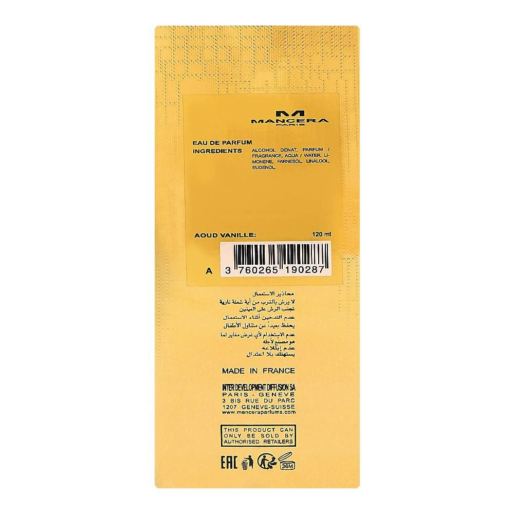 Mancera Aoud Vanille EDP 4.0 oz (Unisex) – A luxurious oriental blend where oud and rich Madagascar vanilla take center stage, enhanced by warm spices and resins. Smooth, long-lasting, and perfect for lovers of deep gourmand-woody scents.